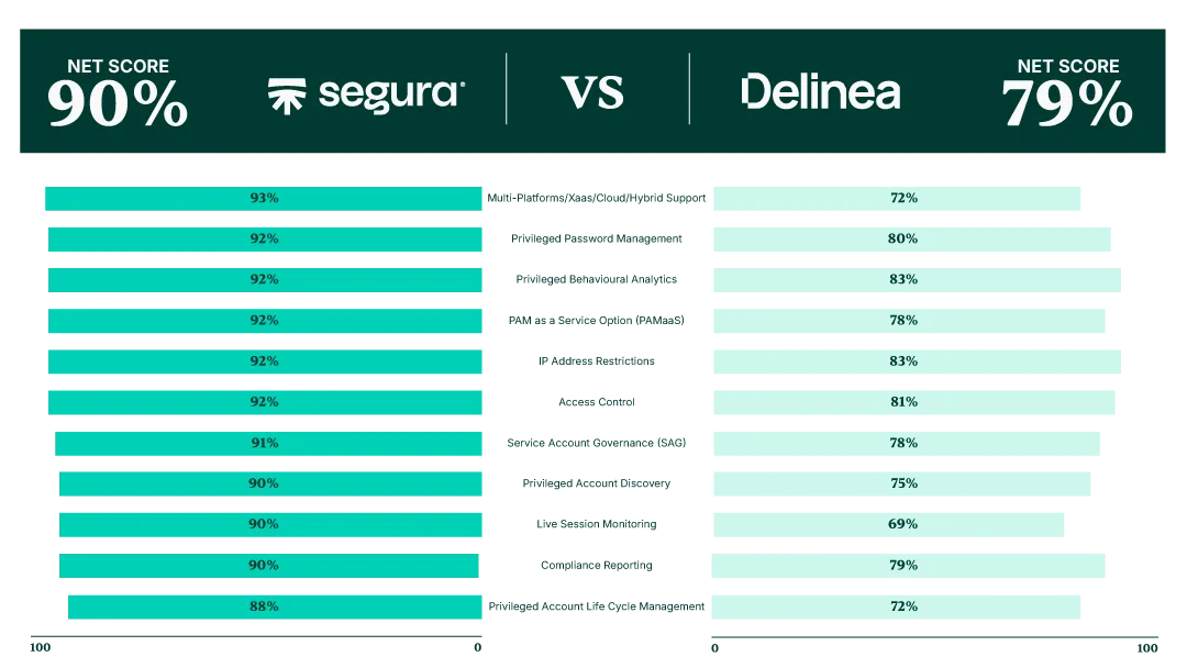 Segura® was named a gold medal winner and top choice by the Info-Tech Research Group in their SoftwareReviews Top Privileged Access Management Software Awards for the year 2023. Segura®’s report, based on real feedback, shows a 99% Likeliness to Recommend and 100% Plan to Renew, along with a Business Value Satisfaction rating of 90%- substantially higher than any other company.